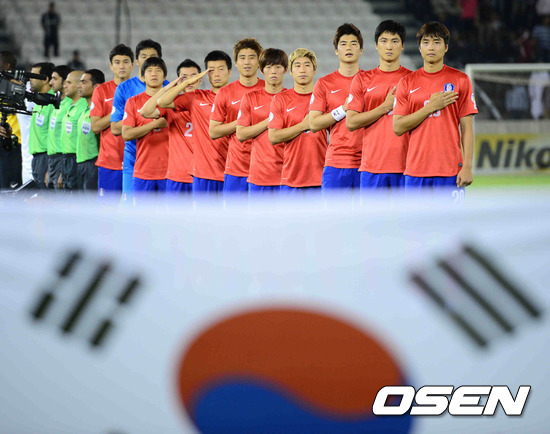 9일 새벽 카타르 도하에서 벌어진 2014브라질 월드컵 최종예선 1차전 카타르와 경기 태극전사들이 국가가 울릴때 태극기에 대한 예를 표하고 있다.