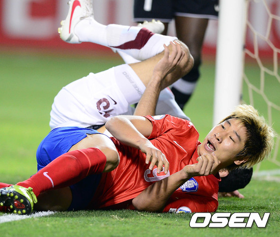 후반 이근호가 카타르 수비와 부딛히며 슈팅기회를 놓친 후 아쉬운 표정을 짓고 있다. /baik@osen.co.kr