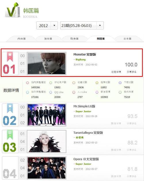 인위에타이 현지 관계자는 "V차트 한국 부문에서 2012년에 평점 100점을 받은 뮤직비디오는 딱 두 편이다. 빅뱅이 ‘배드보이’와 ‘몬스터’ 뮤직비디오로 2012년 딱 두 번의 만점 기록을 모두 휩쓸었다"고 밝혔다.