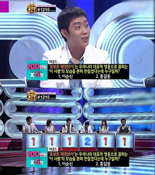이날 방송에서는 '로보트 태권브이는 우리나라 대표적 영웅으로 꼽히는 이 사람의 모습을 본떠 만들었다는데 누구일까'라는 객관식 문제가 출제됐고, 보기로는 이순신과 홍길동이 주어졌다.