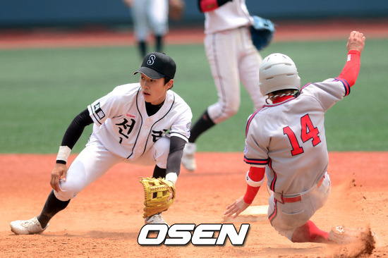9일 오후 서울 신월동 신월야구장에서 열린 '2012 고교야구 후반기 리그' 충암고와 선린인고의 경기, 3회초 2사 1루 1루 주자 최현성이 2루 도루에 성공하고 있다.