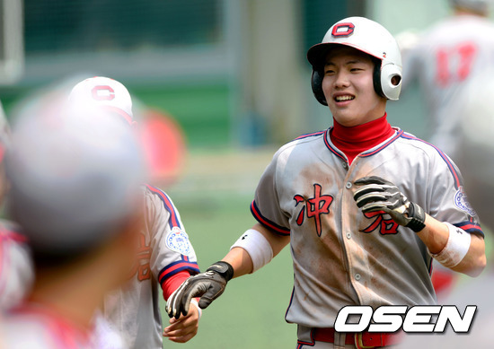 9일 오후 서울 신월동 신월야구장에서 열린 '2012 고교야구 후반기 리그' 충암고와 선린인고의 경기, 2회초 충암고 김태훈이 득점에 성공한 후 기뻐하고 있다.