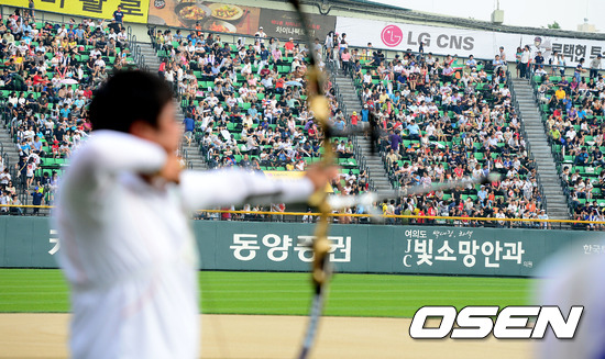 9일 오후 잠실구장에서 열린 '2012 팔도 프로야구' LG 트윈스와 두산 베어스의 경기, 경기에 앞서 양궁 국가대표 선수들이 소음 적응훈련을 하고 있다.