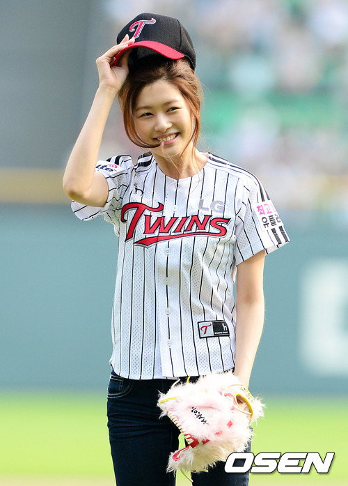 9일 오후 잠실구장에서 열린 '2012 팔도 프로야구' LG 트윈스와 두산 베어스의 경기, 경기에 앞서 배우 정소민이 시구를 마치고 인사를 하고 있다.