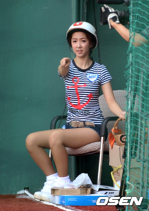 9일 오후 부산 사직야구장에서 열린 '2012 팔도 프로야구' 롯데 자이언츠와 KIA 타이거즈의 경기, 1회말 롯데 배트걸 신소정 양이 공이 떨어진 위치를 가리키고 있다.