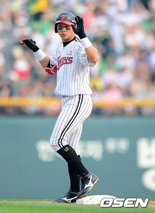 9일 오후 잠실구장에서 열린 '2012 팔도 프로야구' LG 트윈스와 두산 베어스의 경기, 2회말 2사 2루에서 LG 오지환이 역전 1타점 적시 2루타를 날리고 타임을 외치고 있다.
