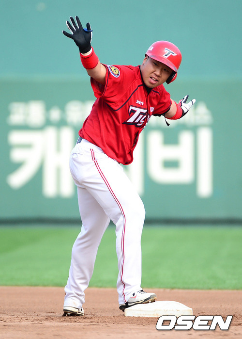 9일 오후 부산 사직야구장에서 열린 '2012 팔도 프로야구' 롯데 자이언츠와 KIA 타이거즈의 경기, 4회초 1사 2루 KIA 이범호가 좌전 1타점 선제 적시타를 치고 타임을 외치고 있다.