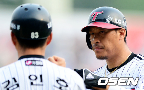 9일 오후 잠실구장에서 열린 '2012 팔도 프로야구' LG 트윈스와 두산 베어스의 경기, 1회말 1사 3루에서 LG 이병규가 동점 적시타를 날리고 김인호 코치와 주먹을 맞대고 있다.