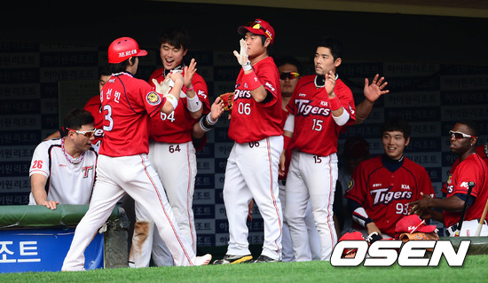 9일 오후 부산 사직야구장에서 열린 '2012 팔도 프로야구' 롯데 자이언츠와 KIA 타이거즈의 경기, 4회초 1사 2루 KIA 이범호의 좌전 1타점 선제 적시타때 홈을 밟은 2루주자 김선빈이 더그아웃에서 동료들과 하이파이브를 하고 있다.