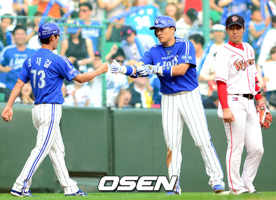 9일 오후 인천 문학구장에서 열린 '2012 팔도 프로야구' SK 와이번스와 삼성 라이온즈의 경기, 4회초 1사 2루 삼성 이승엽이 적시타를 치고 박정권의 실책을 틈 타 3루에 진루 김재걸 코치와 기뻐하고 있다.