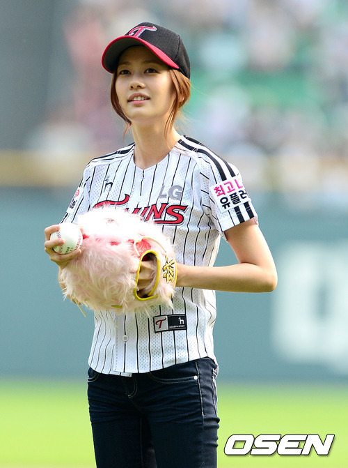 9일 오후 잠실구장에서 열린 '2012 팔도 프로야구' LG 트윈스와 두산 베어스의 경기, 경기전 시구자로 나선 배우 정소민이 글러브를 착용하며 준비를 하고 있다.
