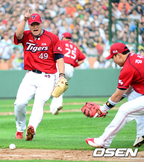 9일 오후 부산 사직야구장에서 열린 '2012 팔도 프로야구' 롯데 자이언츠와 KIA 타이거즈의 경기, 5회말 무사 1루 KIA 김진우가 롯데 박종윤의 번트 타구를 잡으려는 김주형에게 주자의 위치를 알려주고 있다.