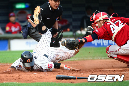9일 오후 부산 사직야구장에서 열린 '2012 팔도 프로야구' 롯데 자이언츠와 KIA 타이거즈의 경기, 5회말 2사 2루 롯데 박준서의 좌전 1타점 동점 적시타때 2루루자 강민호가 홈으로 쇄도해 세이프 되고 있다.