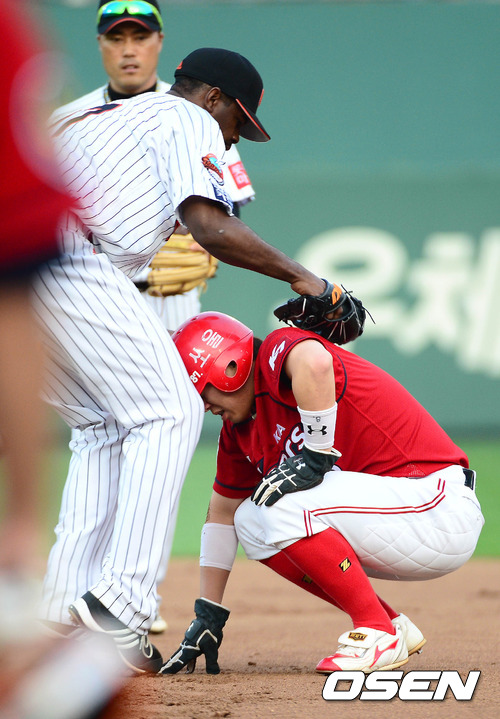 9일 오후 부산 사직야구장에서 열린 '2012 팔도 프로야구' 롯데 자이언츠와 KIA 타이거즈의 경기, 6회초 1사 1루 KIA 나지완 타석때 도루를 시도하다 넘어진 1루주자 안치홍이 롯데 유먼에게 태그아웃 처리되고 있다.