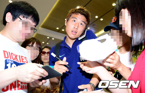 9일 오후 카타르와의 2014 브라질 월드컵 아시아지역 최종예서 1차전 경기를 마치고 인천국제공항을 통해 입국한 구자철이 입국장에서 팬들에게 사인을 해주고 있다.