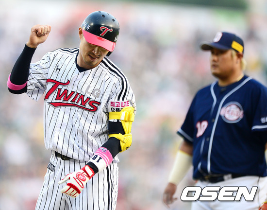 9일 오후 잠실구장에서 열린 '2012 팔도 프로야구' LG 트윈스와 두산 베어스의 경기, 5회말 무사 1,2루에서 LG 정성훈이 안타를 날리고 찬스를 이어가며 주먹을 불끈쥐고 있다.
