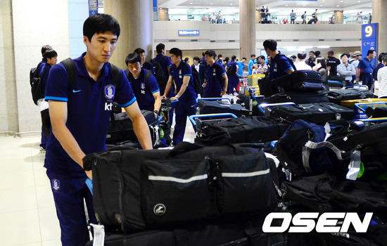 9일 오후 카타르와의 2014 브라질 월드컵 아시아지역 최종예서 1차전 경기를 마치고 인천국제공항을 통해 입국한 곽태휘가 짐을 옮기고 있다.