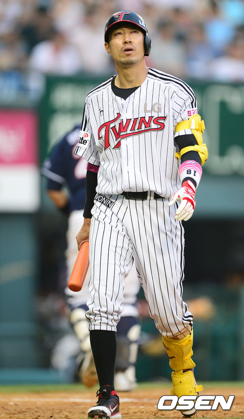 9일 오후 잠실구장에서 열린 '2012 팔도 프로야구' LG 트윈스와 두산 베어스의 경기, 6회말 2사에서 LG 정성훈이 헛스윙 삼진으로 물러나며 아쉬워하고 있다.