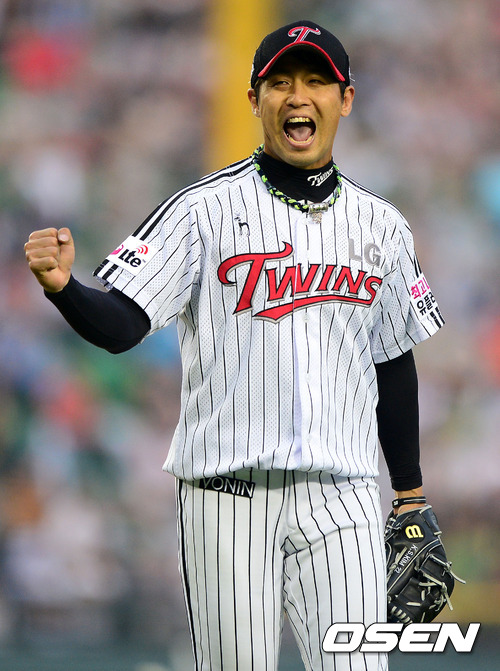 9일 오후 잠실구장에서 열린 '2012 팔도 프로야구' LG 트윈스와 두산 베어스의 경기, 7회초 1사 1루에서 LG 김광삼이 두산 양의지를 내야땅볼 병살로 처리하고 주먹을 불끈쥐며 기뻐하고 있다.