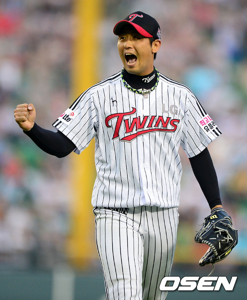 9일 오후 잠실구장에서 열린 '2012 팔도 프로야구' LG 트윈스와 두산 베어스의 경기, 7회초 1사 1루에서 LG 김광삼이 두산 양의지를 내야땅볼 병살로 처리하고 주먹을 불끈쥐며 기뻐하고 있다.