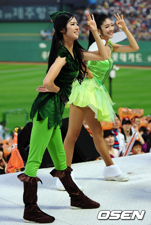 9일 오후 부산 사직야구장에서 열린 '2012 팔도 프로야구' 롯데 자이언츠와 KIA 타이거즈의 경기, 7회말 롯데 치어리더 박기량과 김연정이 화려한 공연을 펼치고 있다.