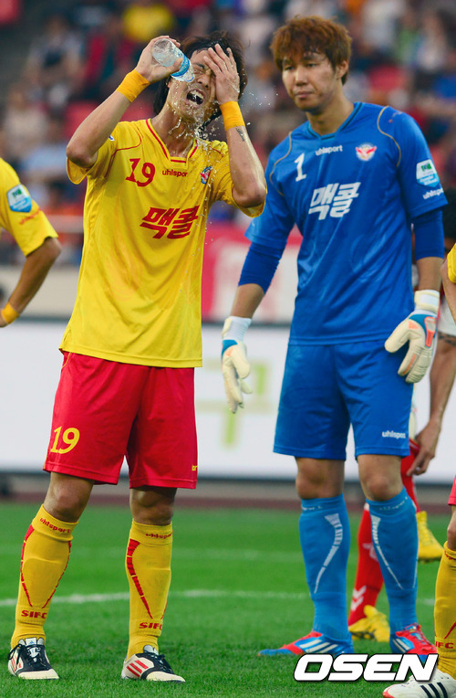 9일 오후 성남 탄천종합운동장에서 벌어진 2012시즌 현대오일뱅크 15라운드 K-리그 성남 일화- 경남 FC 경기에서 성남 남궁웅이 시원한 물로 더위를 식히고 있다.