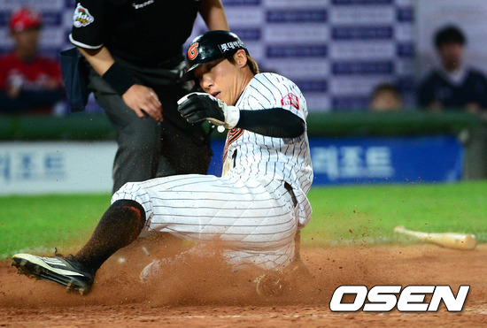 9일 오후 부산 사직야구장에서 열린 '2012 팔도 프로야구' 롯데 자이언츠와 KIA 타이거즈의 경기, 8회말 1사 2루 롯데 김주찬의 중전 1타점 역전 적시타때 2루주자 이승화가 홈에서 세이프 되고 있다.