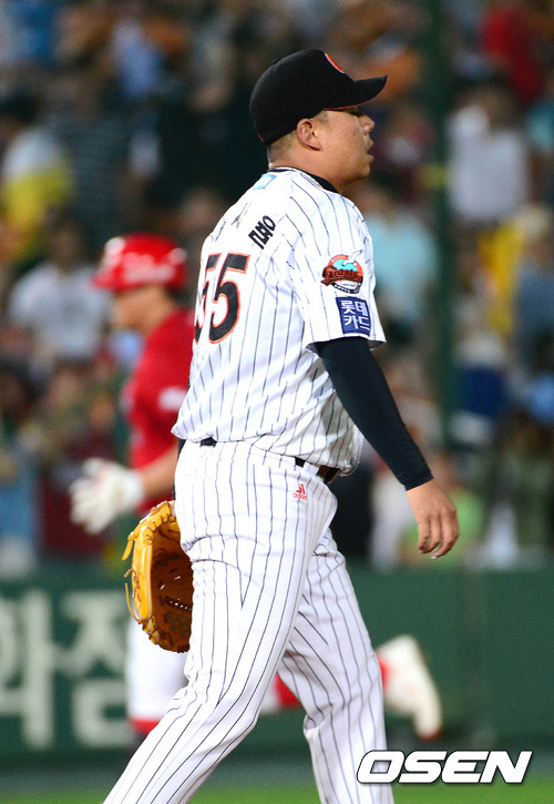 9일 오후 부산 사직야구장에서 열린 '2012 팔도 프로야구' 롯데 자이언츠와 KIA 타이거즈의 경기, 9회초 무사 KIA 최희섭에게 우중월 동점 솔로포를 허용한 롯데 김사율이 아쉬워하고 있다.
