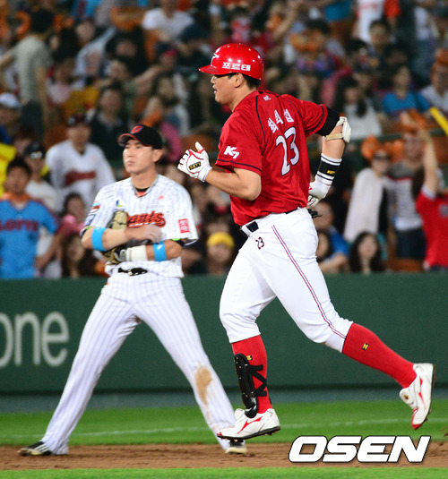 9일 오후 부산 사직야구장에서 열린 '2012 팔도 프로야구' 롯데 자이언츠와 KIA 타이거즈의 경기, 9회초 무사 KIA 최희섭이 우중월 동점 솔로포를 치고 그라운드를 돌고 있다.