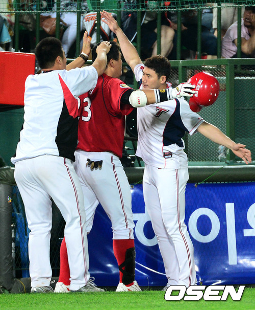 9일 오후 부산 사직야구장에서 열린 '2012 팔도 프로야구' 롯데 자이언츠와 KIA 타이거즈의 경기, 9회초 무사 KIA 최희섭이 우중월 동점 솔로포를 치고 더그아웃에서 김진우와 서재응의 축하를 받고 있다.