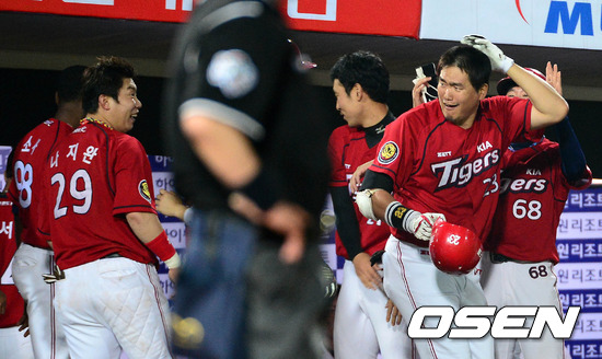 9일 오후 부산 사직야구장에서 열린 '2012 팔도 프로야구' 롯데 자이언츠와 KIA 타이거즈의 경기, 9회초 무사 KIA 최희섭이 우중월 동점 솔로포를 치고 더그아웃에서 동료들의 축하를 받던 중 머리를 만지며 미소를 짓고 있다.