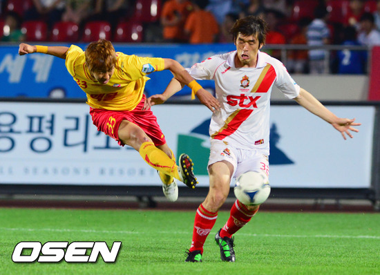 9일 오후 성남 탄천종합운동장에서 벌어진 2012시즌 현대오일뱅크 15라운드 K-리그 성남 일화- 경남 FC 경기에서 성남 김현우가 강슛을 날리고 있다.