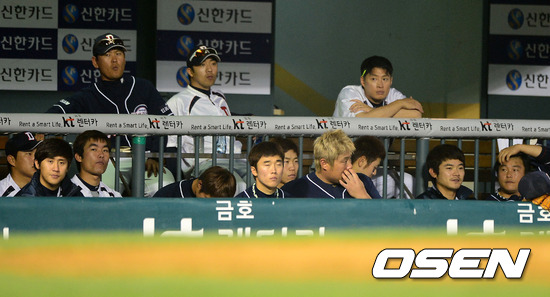 9회 패색이 짙은 두산 선수들이 더그아웃에서 경기를 지켜보고 있다. 두산은 LG를 상대로 1승 6패. /jpnews@osen.co.kr