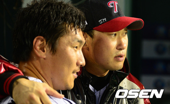 9회 LG 이동현이 유원상과 교체되며 더그아웃에서 봉중근과 이야기를 나누고 있다. /jpnews@osen.co.kr