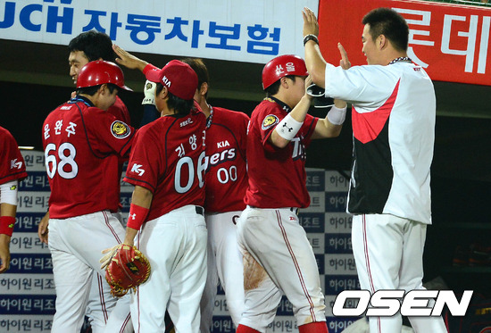 9일 오후 부산 사직야구장에서 열린 '2012 팔도 프로야구' 롯데 자이언츠와 KIA 타이거즈의 경기, 10회초 무사 만루 KIA 김원섭의 내야 안타때 롯데 박종윤의 실책으로 홈을 밟은 2루주자 윤완주와 3루주자 안치홍이 더그아웃에서 동료들의 축하를 받고 있다.