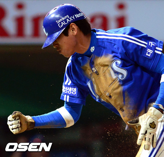 9회초 1사 2,3루 삼성 김상수의 스퀴즈번트로 3루 주자 강명구가 득점에 성공한 후 환호하고 있다. / youngrae@osen.co.kr