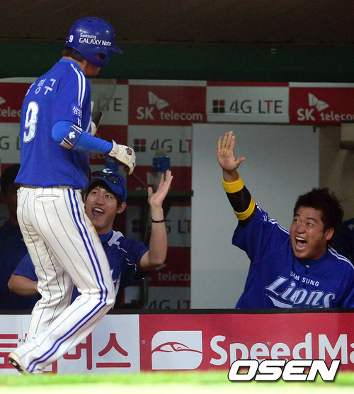 9회말 1사 3루 삼성 김상수의 스퀴즈번트로 득점에 성공한 강명구가 덕아웃에서 선수들과 기뻐하고 있다. / youngrae@osen.co.kr