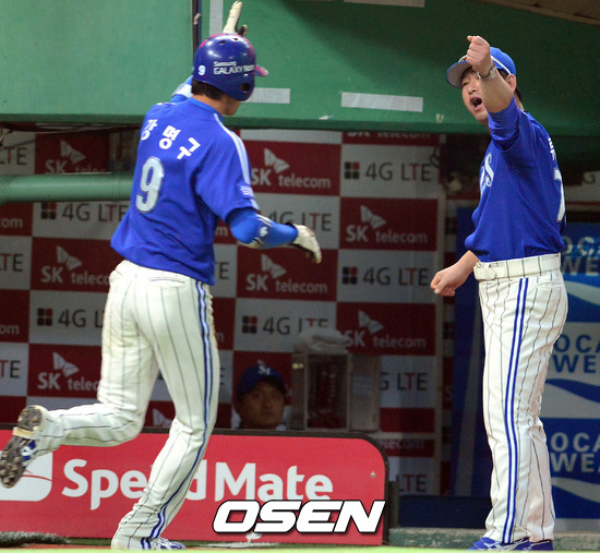 9회말 1사 2,3루 삼성 김상수의 스퀴즈번트로 결승득점에 성공한 강명구가 류중일 감독과 기뻐하고 있다. / youngrae@osen.co.kr