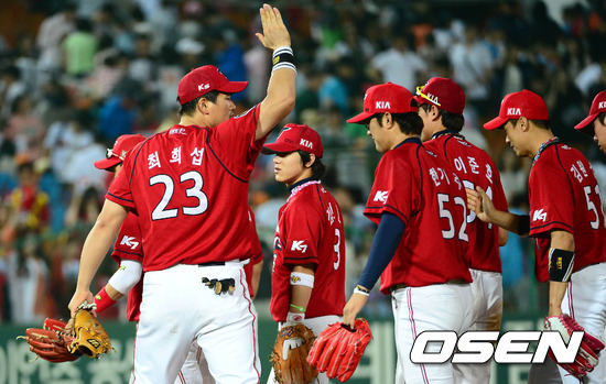 경기 종료 후 KIA 최희섭이 동료들과 승리의 기쁨을 나누고 있다. / sunday@osen.co.kr