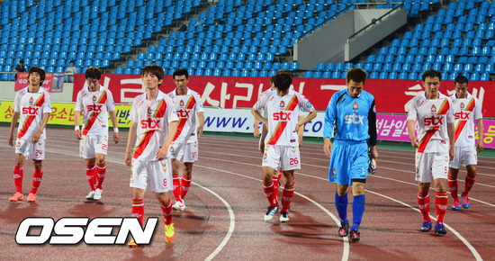 경기 종료후 경남 선수들이 고개를 숙인채 퇴장하고 있다./ ouxou@osen.co.kr