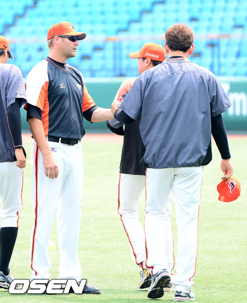 10일 오후 대전 한밭야구장에서 열린 '2012 팔도 프로야구' 한화 이글스와 넥센 히어로즈의 경기에 앞서 한화 새로운 외국인 투수 션헨이 양훈과 하이파이브를 하고 있다.