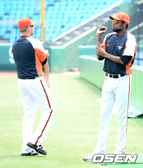 10일 오후 대전 한밭야구장에서 열린 '2012 팔도 프로야구' 한화 이글스와 넥센 히어로즈의 경기에 앞서 한화 새로운 외국인 투수 션헨과 바티스타가 그라운드에 나가 몸을 풀고 있다.