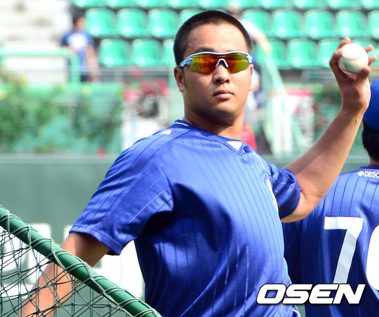 9일 오후 인천 문학구장에서 열린 '2012 팔도 프로야구' SK 와이번스와 삼성 라이온즈의 경기전 삼성 채태인이 타자들을 위해 배팅볼을 던져주고 있다.