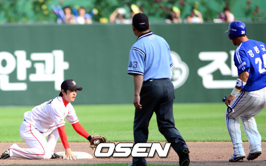 9일 오후 인천 문학구장에서 열린 '2012 팔도 프로야구' SK 와이번스와 삼성 라이온즈의 경기, 1회 2사 1루 삼성 강봉규가 2루 도루를 시도하다 아웃당하고 있다.