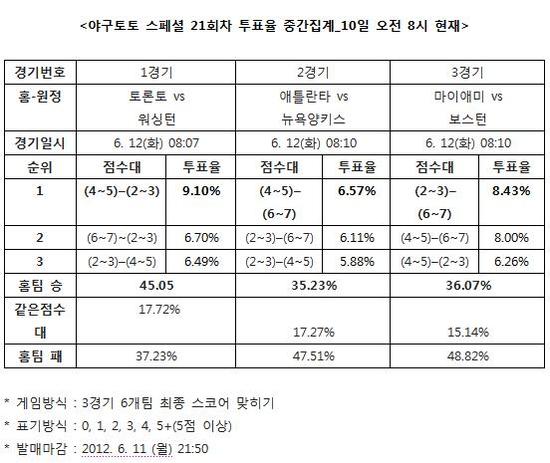[야구토토] 국민체육진흥공단(www.kspo.or.kr)이 발행하는 체육진흥투표권 수탁사업자인 스포츠토토 공식 온라인 발매 사이트인 베트맨(www.betman.co.kr)이 오는 12일 열리는 미국프로야구(MLB) 3경기를 대상으로 한 야구토토 스페셜 21회차 투표율을 중간집계한 결과, 국내 야구팬의 45.05%는 토론토-워싱턴(1경기)전에서 토론토의 승리를 내다봤다고 전했다.