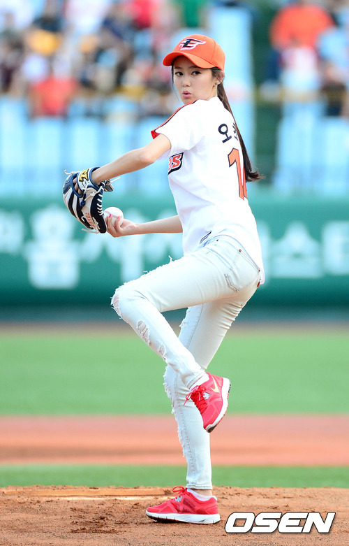 10일 오후 대전 한밭야구장에서 열린 '2012 팔도 프로야구' 한화 이글스와 넥센 히어로즈의 경기에 앞서 방송인 오초희가 시구를 하고 있다.