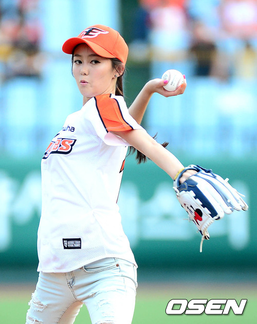10일 오후 대전 한밭야구장에서 열린 '2012 팔도 프로야구' 한화 이글스와 넥센 히어로즈의 경기에 앞서 방송인 오초희가 시구를 하고 있다.