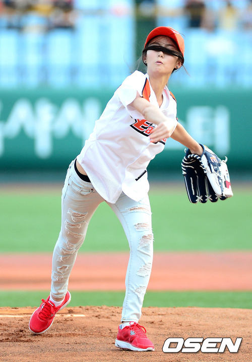 10일 오후 대전 한밭야구장에서 열린 '2012 팔도 프로야구' 한화 이글스와 넥센 히어로즈의 경기에 앞서 방송인 오초희가 시구를 하고 있다.