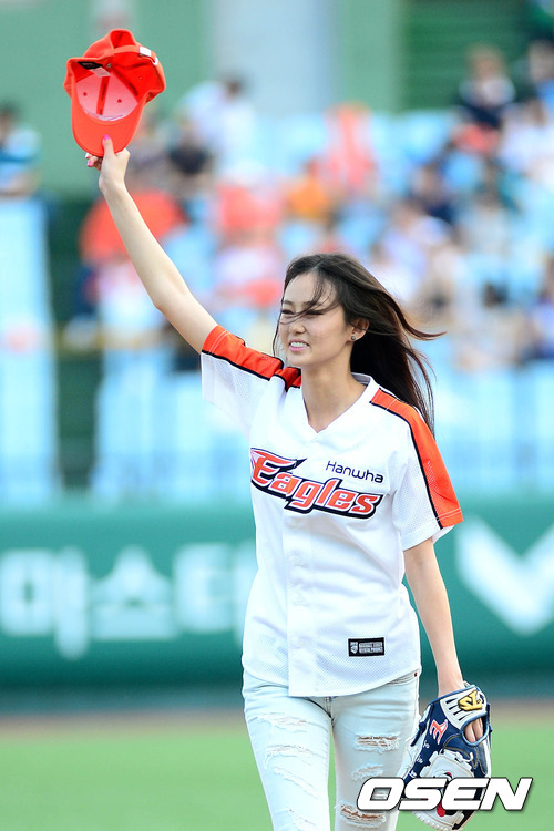 10일 오후 대전 한밭야구장에서 열린 '2012 팔도 프로야구' 한화 이글스와 넥센 히어로즈의 경기에 앞서 방송인 오초희가 시구를 마치고 관중석을 향해 인사를 하고 있다.