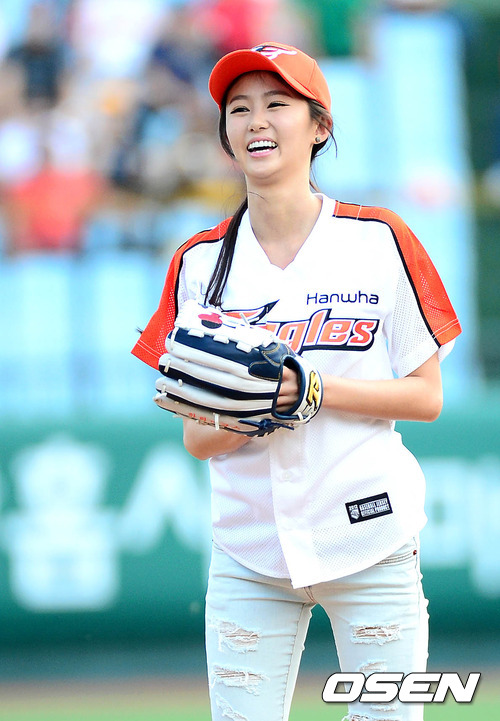 10일 오후 대전 한밭야구장에서 열린 '2012 팔도 프로야구' 한화 이글스와 넥센 히어로즈의 경기에 앞서 방송인 오초희가 시구를 마치고 환하게 웃고 있다.